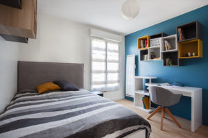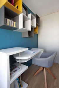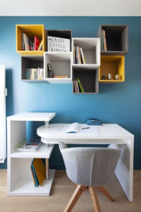 Antoine grandissant, souhaitait se séparer de sa chambre d’enfant pour une chambre d’ado avec des rangements, des couleurs plus franches et un bureau moderne et fonctionnel.