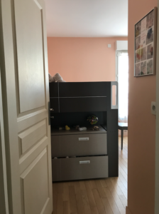 Les rangements ont envahi les murs, sans surchargé l’espace, pour ne pas encombrer le sol.