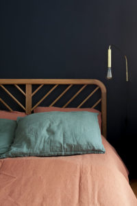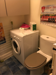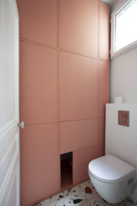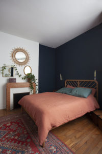 Challenge dans les toilettes : inclure la litère des chats, un lave-linge et du rangement. Dans leur chambre, un joli bleu en tête de lit pour marquer la zone et nous avons également revu le placard dans son intégralité.