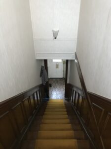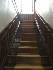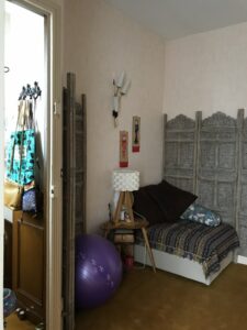 - Les soubassements et contremarches de l’escalier ont été repeintes ainsi que les portes dans un vert de gris faisant lien entre l’entrée et la salle yoga. Cette couleur adoucit la montée. Les marches ont été poncées.