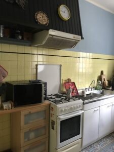 - Gardant le sol et la crédence de la cuisine, nous avons opté pour un modèle beige, so rétro. La robinetterie et les poignées rappellent la bande noire de la crédence.