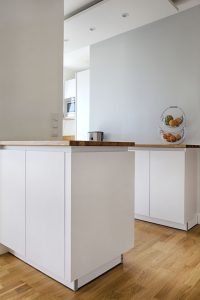 Le sol a été refait en parti, les cloisons déposées pour aérer l’espace mais aussi pour plus de luminosité dans l’entrée. Une ouverture a été créée vers la salle à manger afin de profiter des convives. La cuisine s’harmonise complètement avec la pièce à vivre et dessert l’entrée et la salle à manger avec ses meubles qui se prolongent.