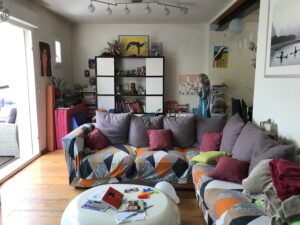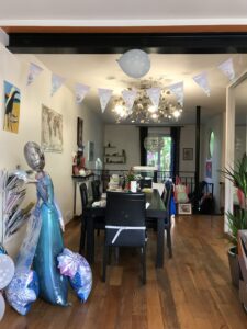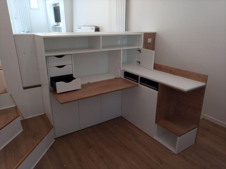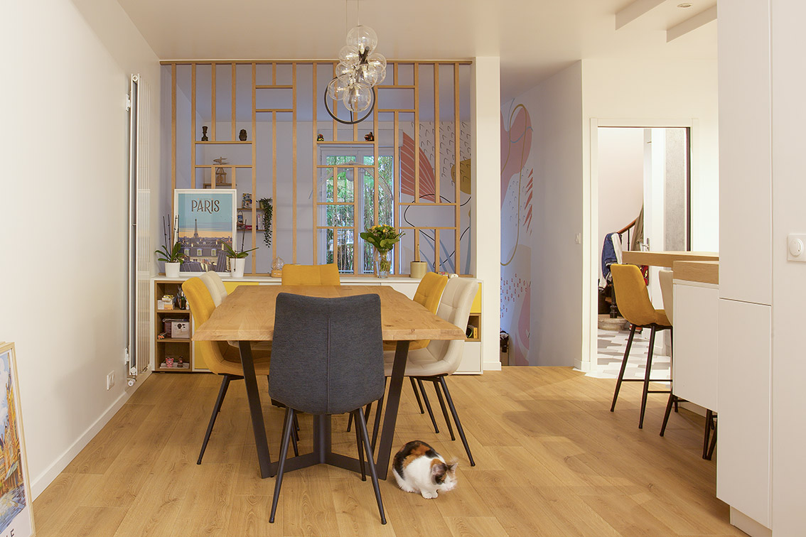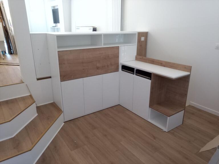 • Un meuble séparatif entre deux niveaux vient également organiser les usages : côté salle à manger, il intègre des rangements généreux ; côté opposé, il accueille un espace bureau et loisirs créatifs, pensé pour les moments de travail et de créativité, avec des rangements adaptés.