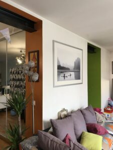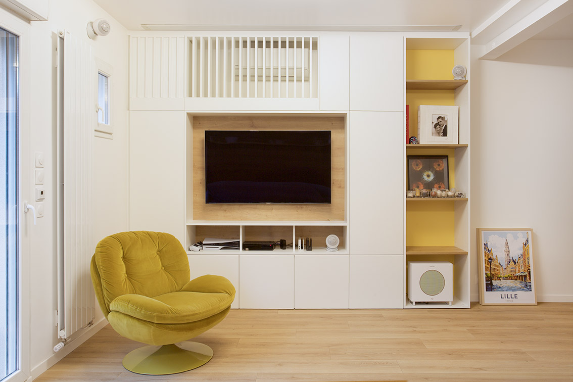 projet, maison, rénovation, décoration, intérieur, contemporain, fonctionnel, meuble sur mesure, rangement,salon, salle a manger, cuisine, pièce à vivre, rez de chaussée, le perreux sur marne, mon oeil dans la déco, jaune, blanc, gris