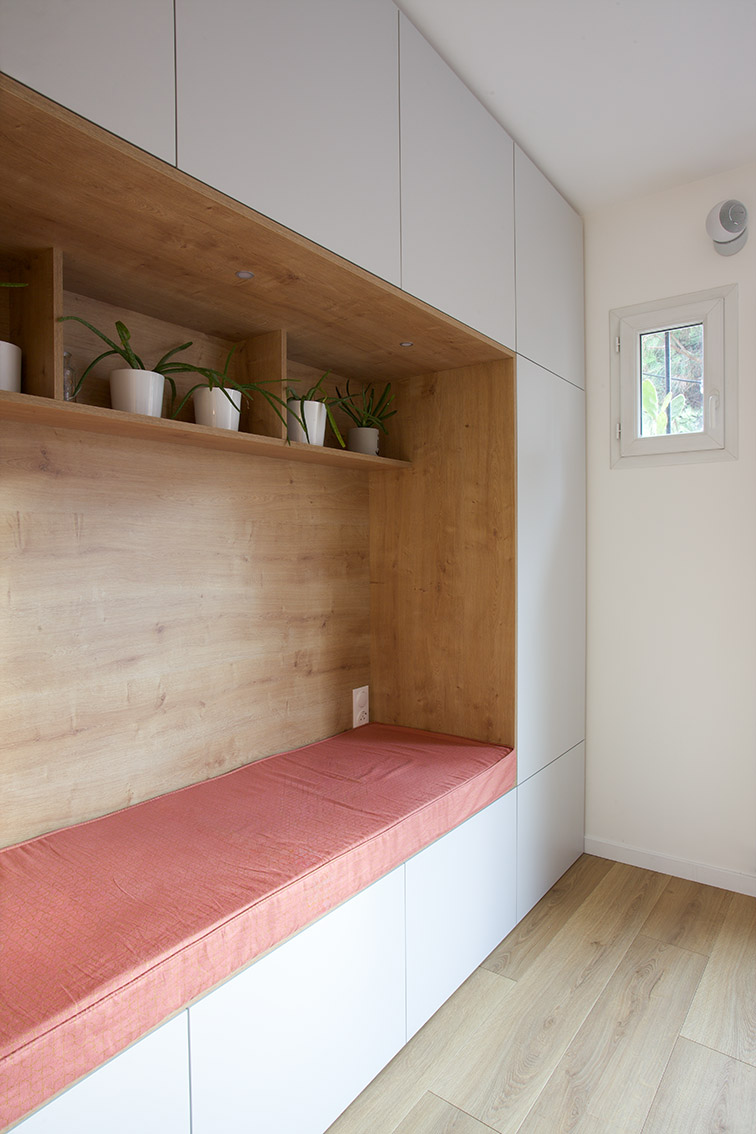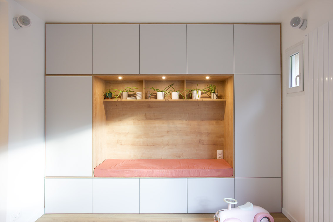 • Un grand meuble sur mesure a été imaginé pour offrir aux enfants un véritable espace dédié, permettant de ranger facilement jeux et jouets mais aussi de s’y poser.