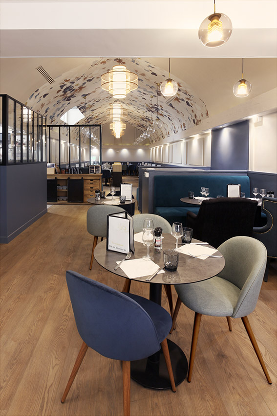 Pour ce restaurant à la salle voûtée, l’enjeu était de révéler l’architecture exceptionnelle du lieu tout en créant une ambiance chaleureuse et contemporaine. L’objectif : valoriser le volume, apporter du confort et offrir une véritable expérience visuelle dès l’entrée.