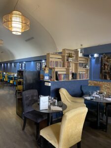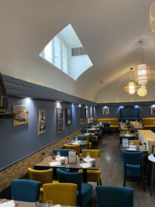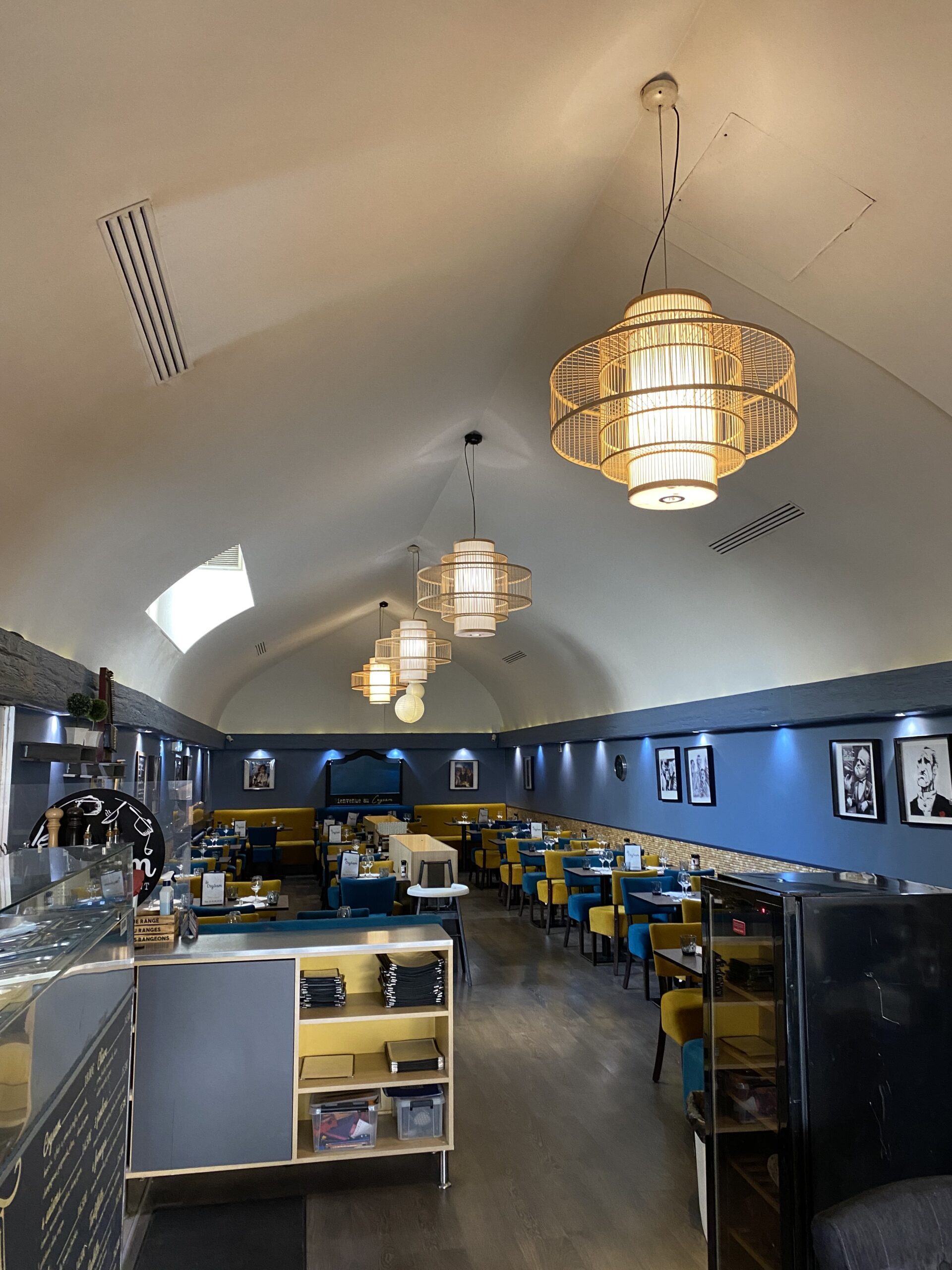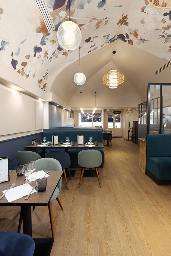 Le restaurant révèle désormais une identité forte et élégante. La fresque du plafond attire le regard et donne le ton, les luminaires rythment l’espace et les assises en velours apportent une touche feutrée et confortable. L’ensemble offre une atmosphère raffinée, accueillante et parfaitement adaptée à l’expérience des convives.