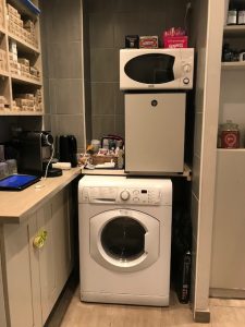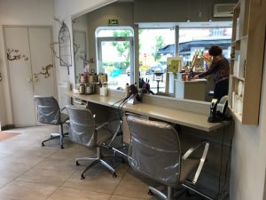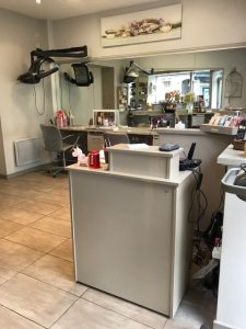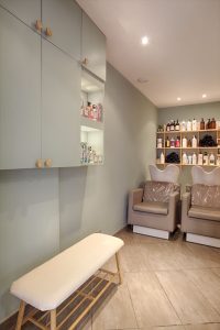 - à l’entrée un range-balai a été créé, plus proche et accessible des poste de coiffage. Il dispose également d’une poubelle à cheveux.