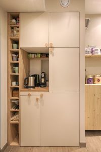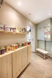- dans l’espace bacs, il a fallu caché le compteur électrique et nous avons profité de cela pour créer des niches de présentation produits